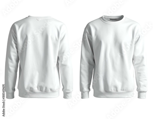 Two white crewneck sweatshirts, front and back views, plain