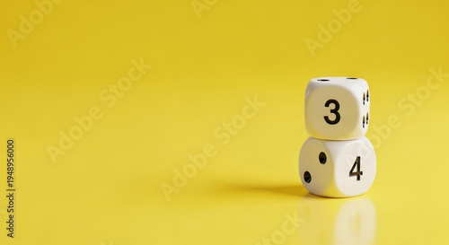 Two white dice showing number three and four on a bright yellow background with copy space