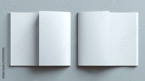 Two white paper books open on a flat, grey surface, with folded pages angled