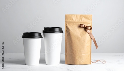 Two white paper coffee cups with black lids and a brown kraft paper bag with a ribbon, a blank template for branding mockup on a clean background