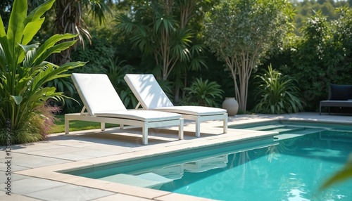 Two white sun loungers stand near pool. Green plants surrounds them in garden. Clear blue water reflects sunlight. Summer vacation leisure and relaxation concept. Luxurious resort, spa or villa.