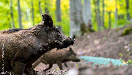 Two wild boars in a forest