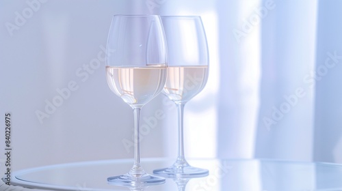 Two wine glasses on table with sheer curtain in background, clink beverage holiday
