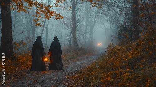 Two women in cloaks holding lanterns walk through a misty, autumn forest.