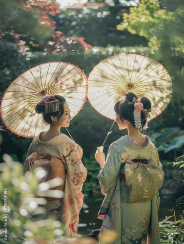 two women in traditional japanese clothing holding umbrellas