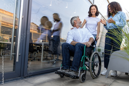 Two women talking to a man on a wheelchair near the office building
