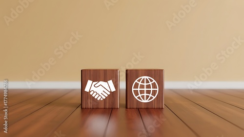 Two wooden blocks, handshake and globe icons, symbolize global business partnership, international cooperation, and strategic alliances