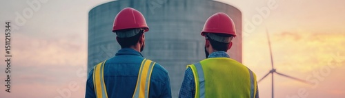Two workers in safety gear observe industrial structures and a wind turbine at sunset.