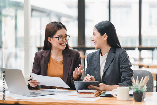 Two young Asian businesswomen discuss an investment project and planning strategy, Talk together while working on laptop computer in the office.