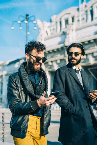 Two young caucasian bearded men usign smartphone