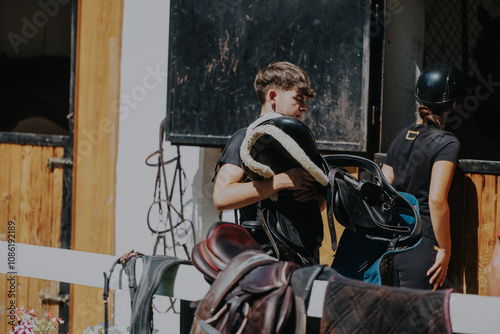 Two young riders prepare their equestrian equipment in a stable setting, emphasizing teamwork and readiness for horseback riding. The scene conveys a sense of focus and responsibility among the youths