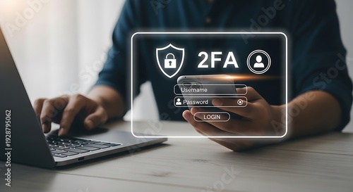 Two-factor authentication login process displayed on smartphone screen with laptop in the background enhancing online security and protection