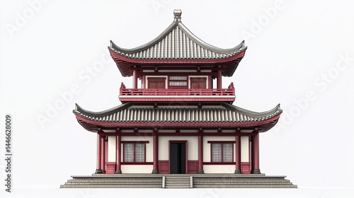 Two-story Chinese pagoda with red columns and grey roof.