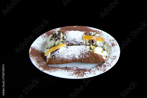 Typical food from Sicily called cannoli siciliani isolated on black background
