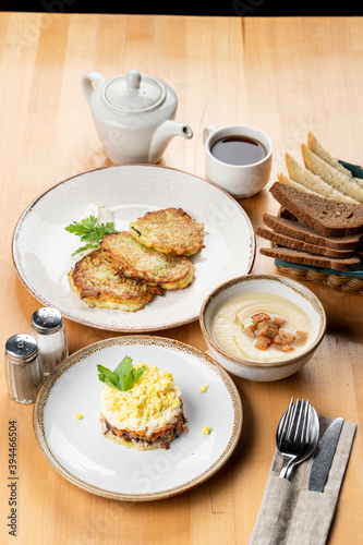 Typical russian lunch in a cafe: mushroom cream soup, mimosa salad and hot serving on a wooden table