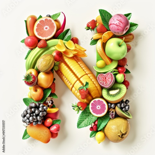 Typography of the letter N crafted from fresh fruit. Fruits and vegetables. Easy to remove background. Creative and healthy concept.