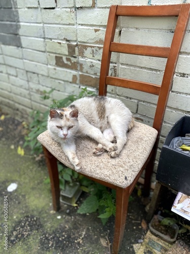 Уличный кот отдыхает на своем стуле в московском дворе