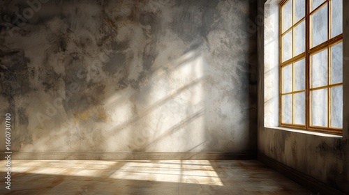 Ultra quality image of sunlit grunge interior, empty room with large window and textured wall.