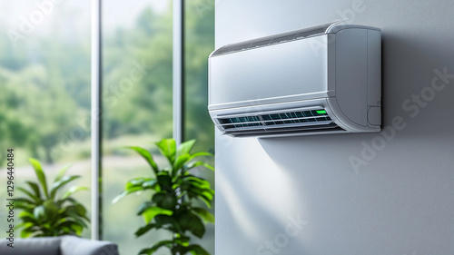 Ultra realistic image of air conditioner mounted on wall, surrounded by greenery and natural light, creating refreshing atmosphere