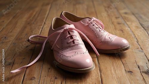 Ultra Realistic Photography of a Pair of Pink Shoes Placed on Wooden Surface