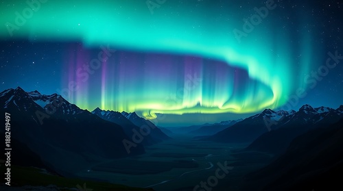 Ultra Wide View of Hyper Realistic Aurora Above a Mountain Valley at Night