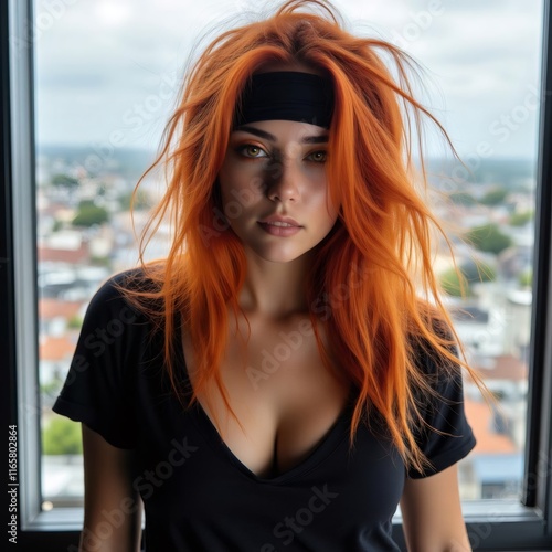 Una mujer con cabello largo y desordenado de color naranja brillante, vestida con una camiseta negra, posando frente a una ventana con una vista urbana al fondo, destacando su estilo audaz y moderno