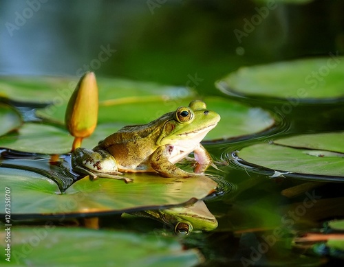 una rana encima de un nenufar en un lago frondoso lleno de nenufares y flores de lotto
