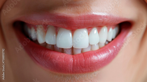 una sonrisa de mujer con dientes y encías blancas y un labio rosa