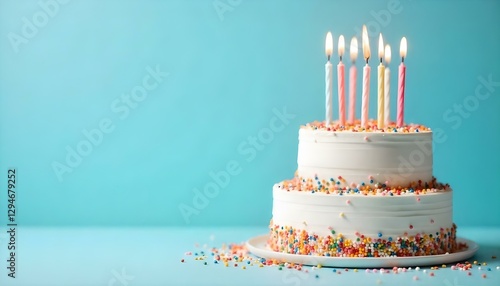 Una toma de estudio muestra un pastel de cumpleaños de tres niveles adornado con velas encendidas y chispitas de colores, sobre un fondo azul claro