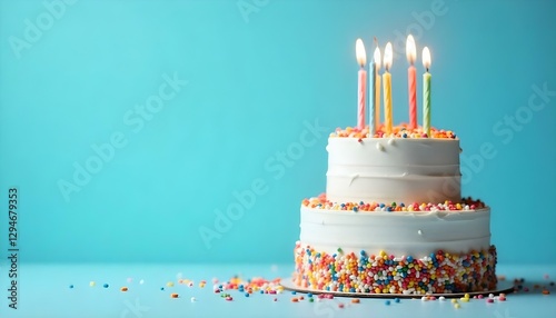 Una toma de estudio muestra un pastel de cumpleaños de tres niveles adornado con velas encendidas y chispitas de colores, sobre un fondo azul claro