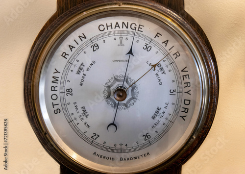 Unbranded antique round dial type aneroid barometer in a wooden frame,