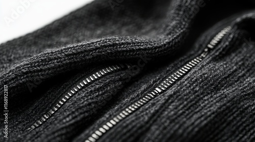Unbuttoned black knit fabric with two zippers on a white background.