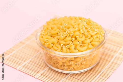 Uncooked Chifferi Rigati Pasta in Glass Jar on Bamboo Mat on Pink Background. Fat and Unhealthy Food. Classic Dry Macaroni. Italian Culture and Cuisine. Raw Pasta