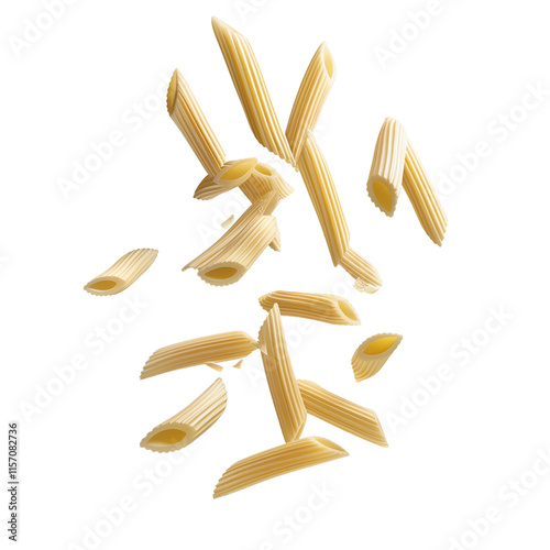 Uncooked Penne Pasta Falling on Transparent Background