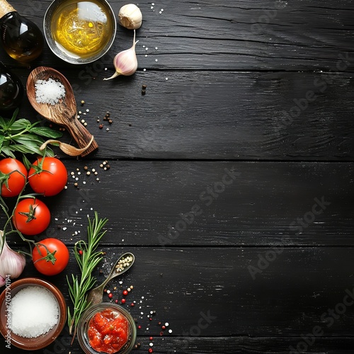 Uncooked substances being cooked against a backdrop of black hardwood, seasoning, Generative AI.