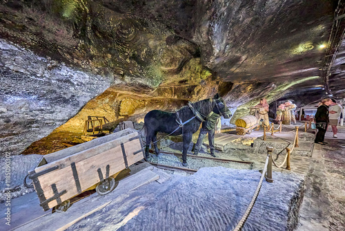 Underground machinery and mining methods used to extract salt rock for several centuries in the Wieliczka salt mine, Krakow, Poland, Europe