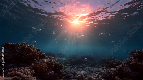 Underwater coral reef bathed in sunbeams from a vibrant sunset