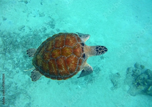 underwater photo of a Green turtle swimming in the ocean top view with great view of the dorsal carapace