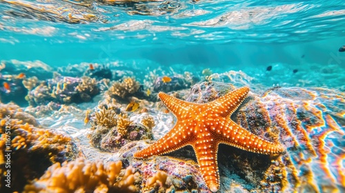 Underwater scene of an orange starfish on a vibrant coral reef with tropical fish.