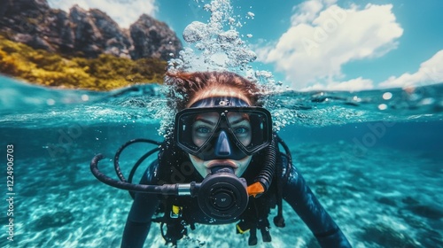Underwater scuba diver woman portrait.