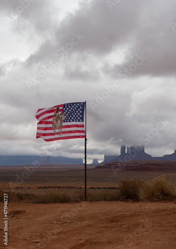 Unfurled American Flag with Native American on Horseback on the Flag and Monument Valley in Background