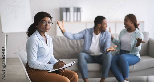Unhappy female psychologist and black married couple having fight during session at office, copy space