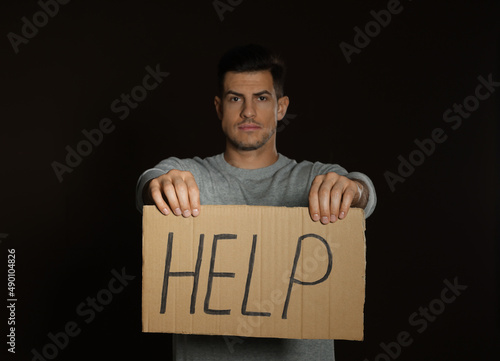 Unhappy man with HELP sign on dark background