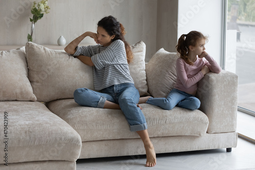 Unhappy mother and stubborn little daughter ignoring each other after quarrel, sitting on couch at home back to back, child and parent conflict concept, family misunderstanding and generation gap