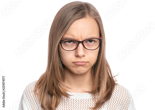 Unhappy or offended Beautiful caucasian Teen Girl in eyeglasses, isolated on white background. Dissatisfied Schoolgirl looking away. Sad child - close-up portrait.