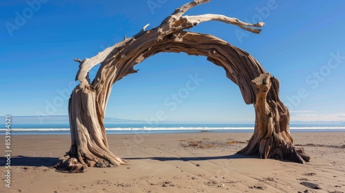 Unique arch-shaped driftwood on serene, sandy beach under clear blue sky