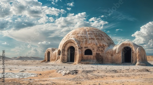 Unique dome-shaped desert dwellings sit under an expansive sky with dramatic clouds, evoking a sense of isolation and wonder..