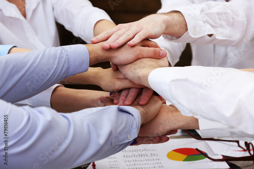 United hands of business team on workspace background