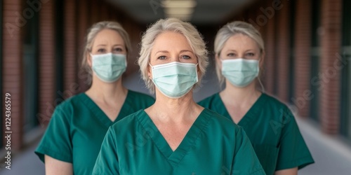 Unity in Healthcare Professional Female Medical Team in Stylish Scrubs and Masks - Hallway Portrait for Public Health Appreciation and Inclusive Medical Campaign