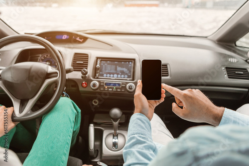 Unrecognizable Couple Driving Car And Using Digital Tablet Computer, Cropped